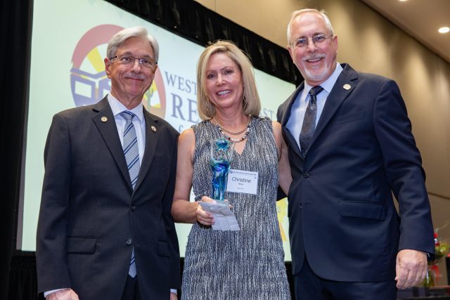 Arizona REALTORS® CEO Michelle Lind (left) announces Doug Groppenbacher as recipient of the Community Outreach Individual Award as presented by Director of Association Relations Monica Schulik. Groppenbacher was honored for delivering sports equipment, medical and school supplies to the Casa Franciscana Outreach in Guaymas, Mexico.