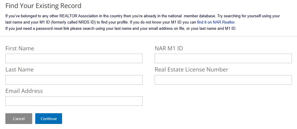 Step 3: You will be directed to search for your account by entering either your Last Name and Email Address or Last Name and M1 (NRDS) number. If you do not know your M1 number, you can find it on NAR.Realtor.