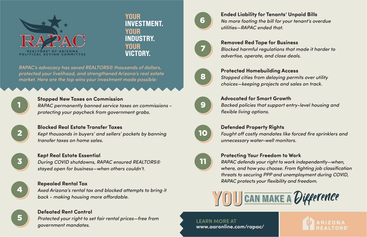 If you care about your business, your clients, and the future of real estate in Arizona, invest in RAPAC. Your voice matters, make sure it’s represented.