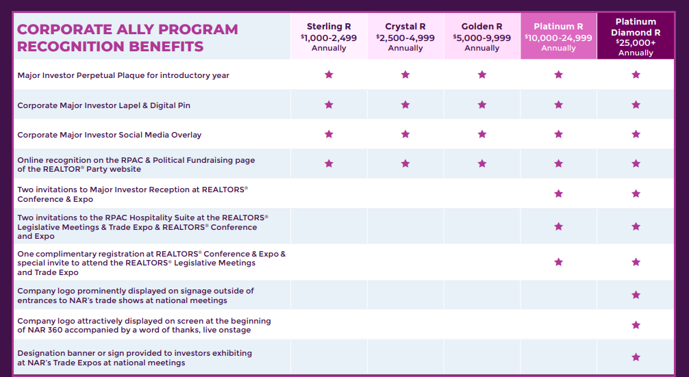 Corporate investors in the REALTOR® Party can receive Major Investor recognition the same way individual members receive recognition as Major Investors of RAPAC. Below are the various levels and the benefits organizations and individuals receive at each level of CAP major investment.